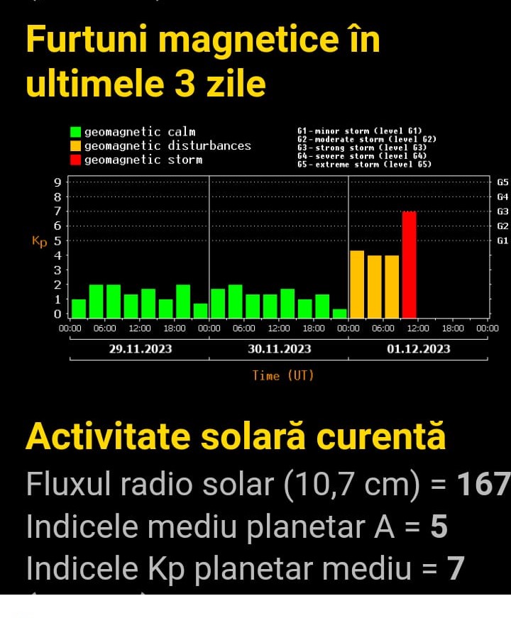 Siteurile de profil indică furtuna geomagnetică de cod roșu, nivel G3. A inceput ceva mai timid la miezul noptii, cu un viguros cod galben, dar a atins apogeul azi la ora 9 si încă nu se știe cât va dura.